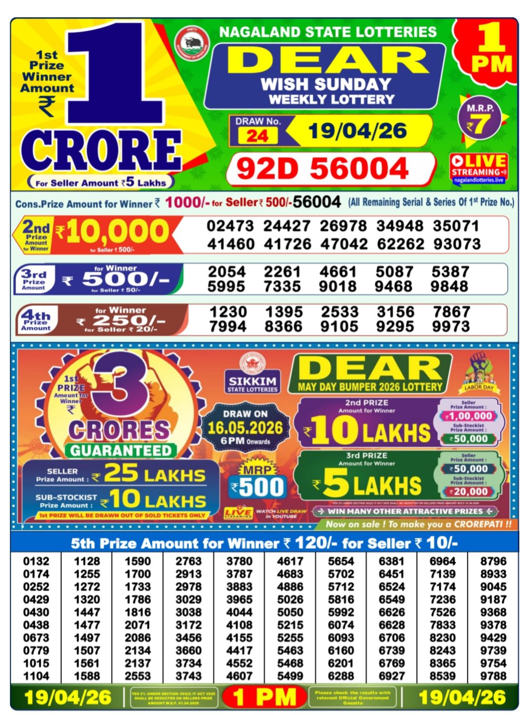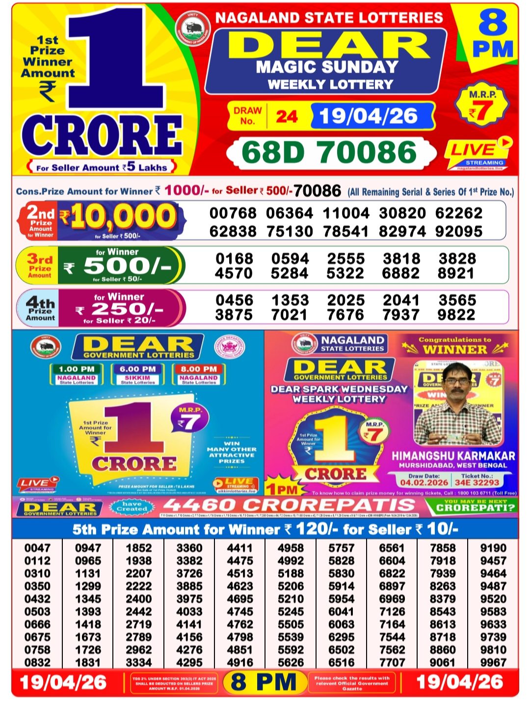 Nagaland State Lotteries presents the Dear Star Thursday Weekly Lottery results for 23/04/2026 (Draw No. 25). The first prize winner receives a massive ₹1 Crore.