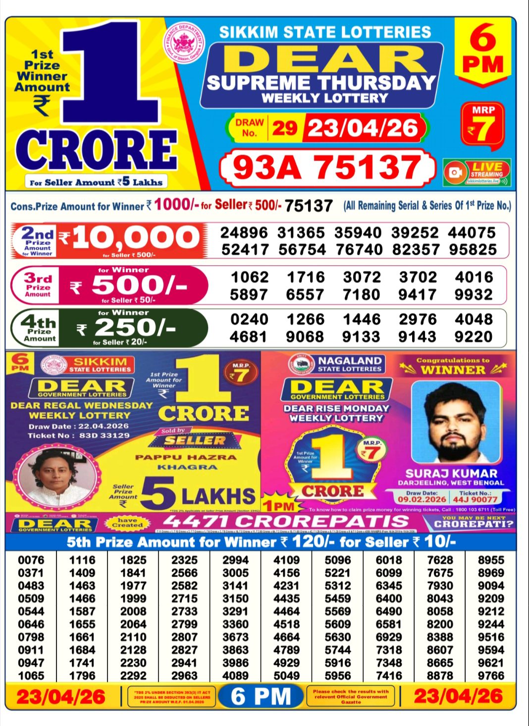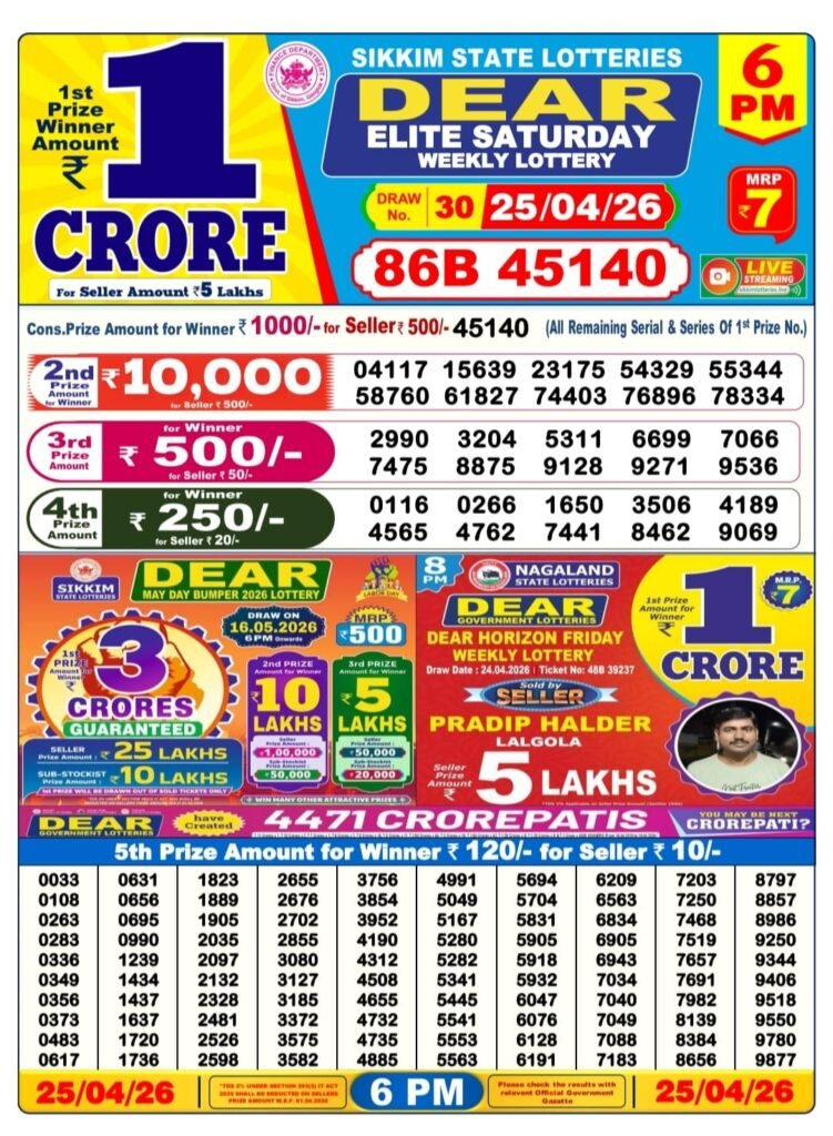 The Sikkim State Lotteries Dear Elite Saturday Weekly Lottery draw was held on 25/04/2026 at 6 PM. Below are the complete results including the jackpot winner and all prize categories.