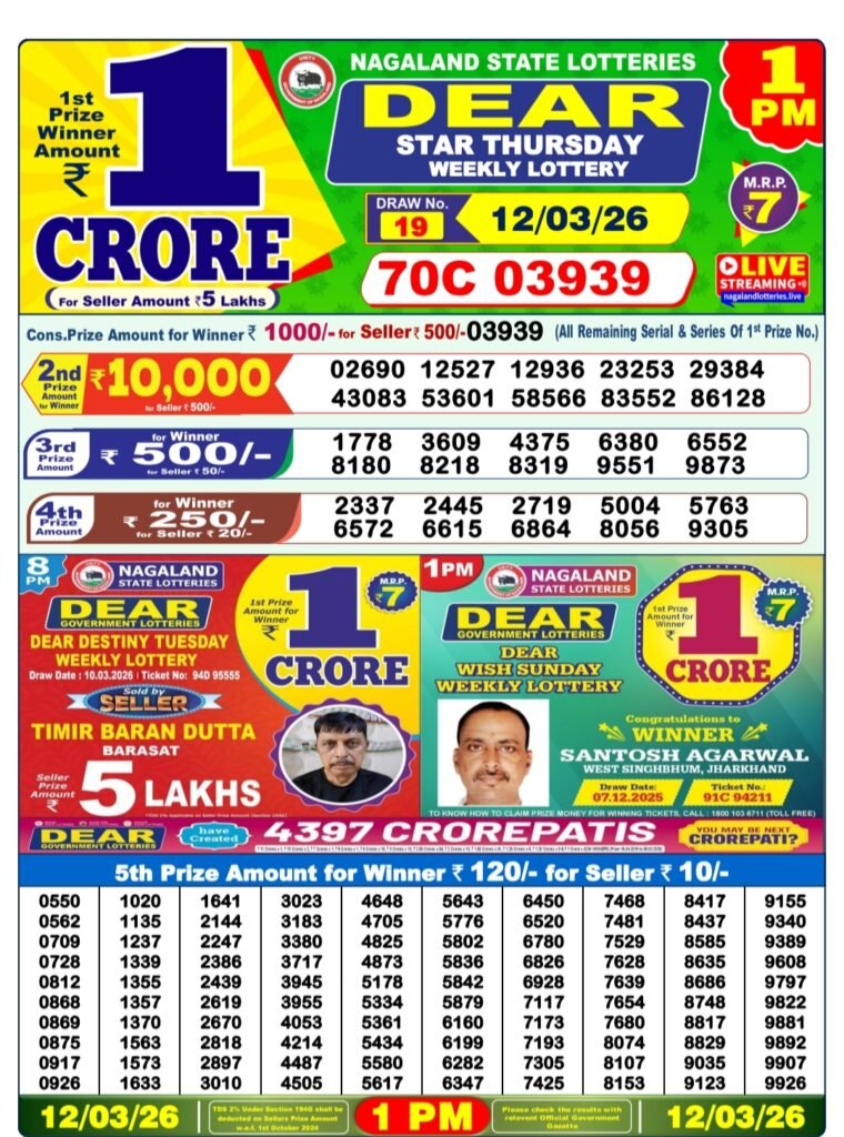 Dear Star Thursday Weekly Lottery Result – 12 March 2026 | Nagaland State Lottery 1 PM Draw