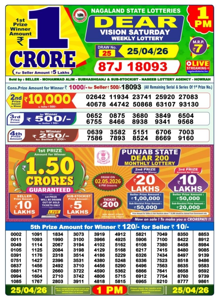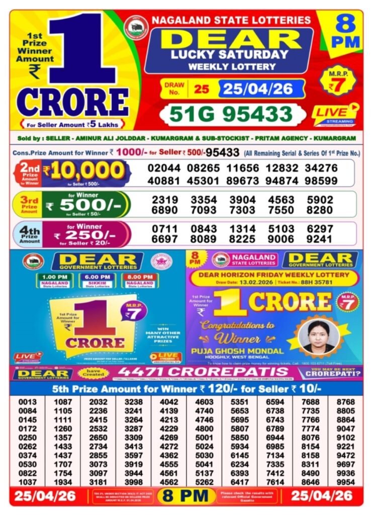 Nagaland State Lotteries presents the Dear Lucky Saturday Weekly Lottery draw held on 25/04/2026 at 8 PM. Check the complete winning numbers and prize distribution below.