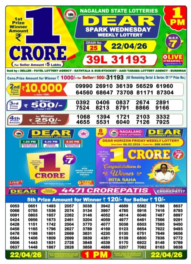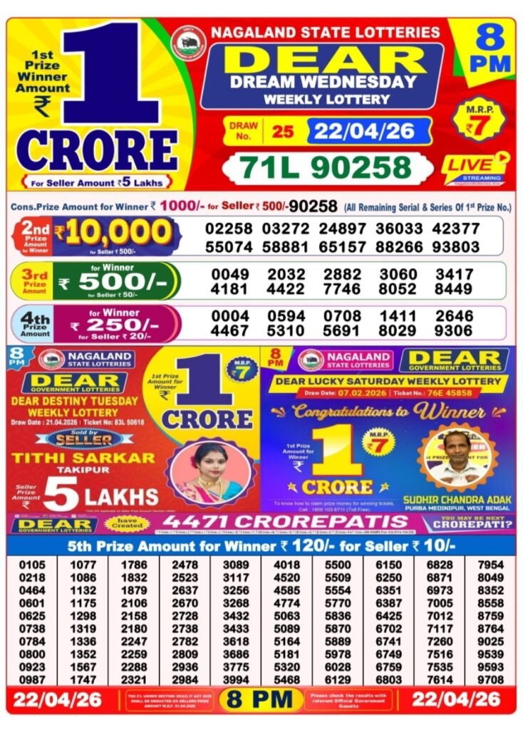 Nagaland State Lotteries announces the Dear Dream Wednesday Weekly Lottery results for draw number 25 held on 22/04/2026 at 8 PM. The first prize winner takes home a massive ₹1 Crore, with ticket number 71L 90258.